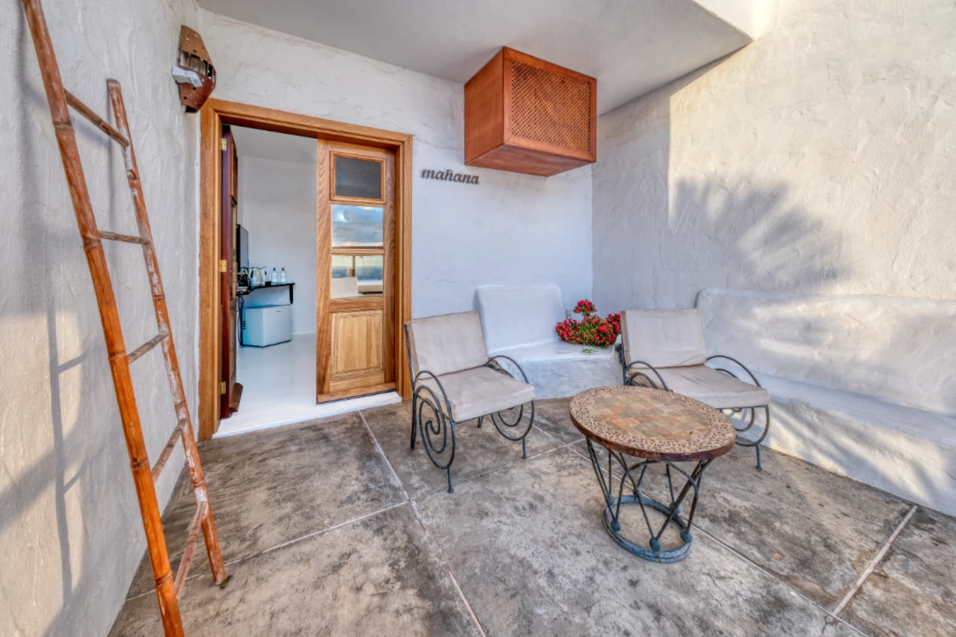 Just outside, a small private patio with seating invites you to enjoy a quiet moment in the fresh air – whether starting the day slowly or unwinding after time spent exploring the island.