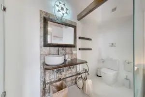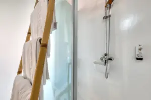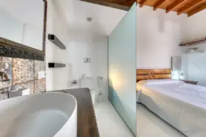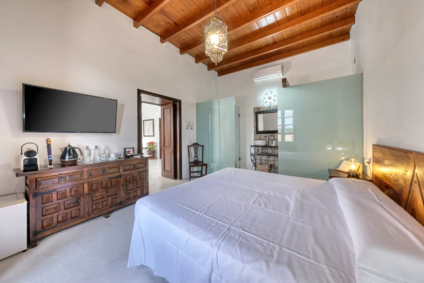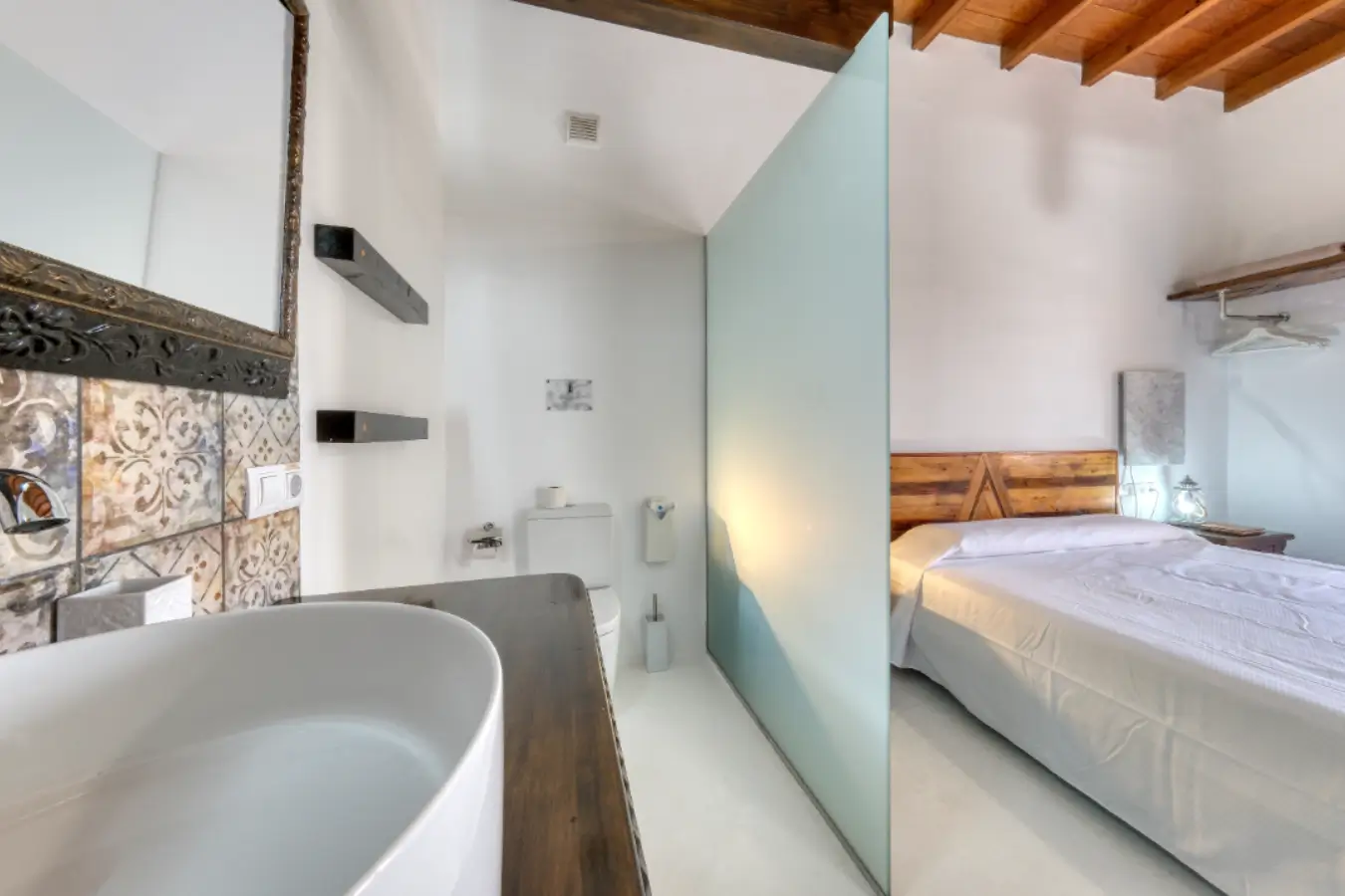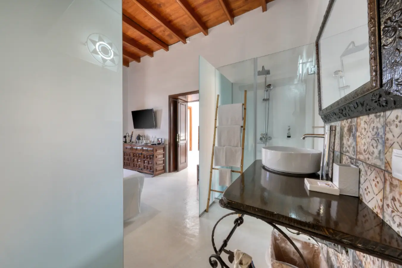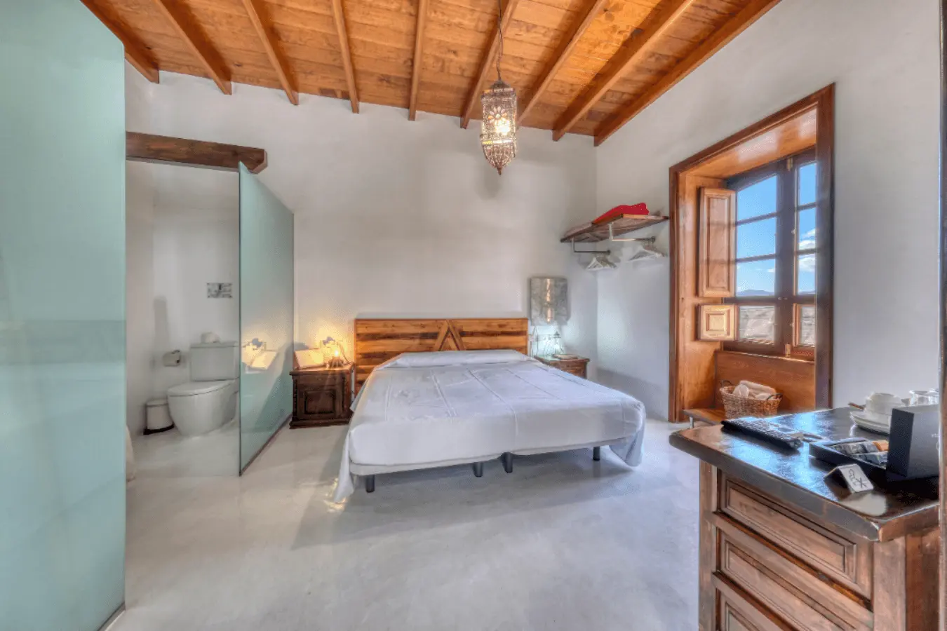 This room has an integrated bathroom, separated only by a frosted glass wall. While all rooms include a shower and toilet, this layout may not be suitable for guests seeking greater privacy. If this is a concern, please consider booking a different room. Rooms with separate bathrooms are: El Mediodía (Queen room with sea view), Eco-Lodge (Deluxe Bungalow with Garden View) and El Atardecer y el amanecer (Junior suite with terrace).