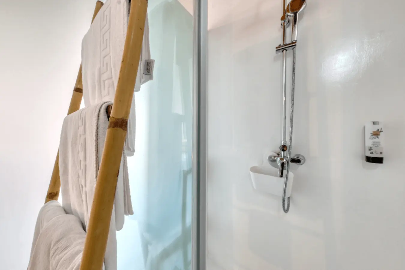 The room offers generous space to unwind, with soft natural light throughout the day and a partial sea view that enhances the sense of openness and calm. Designed for guests who appreciate simplicity, individuality and a peaceful setting.